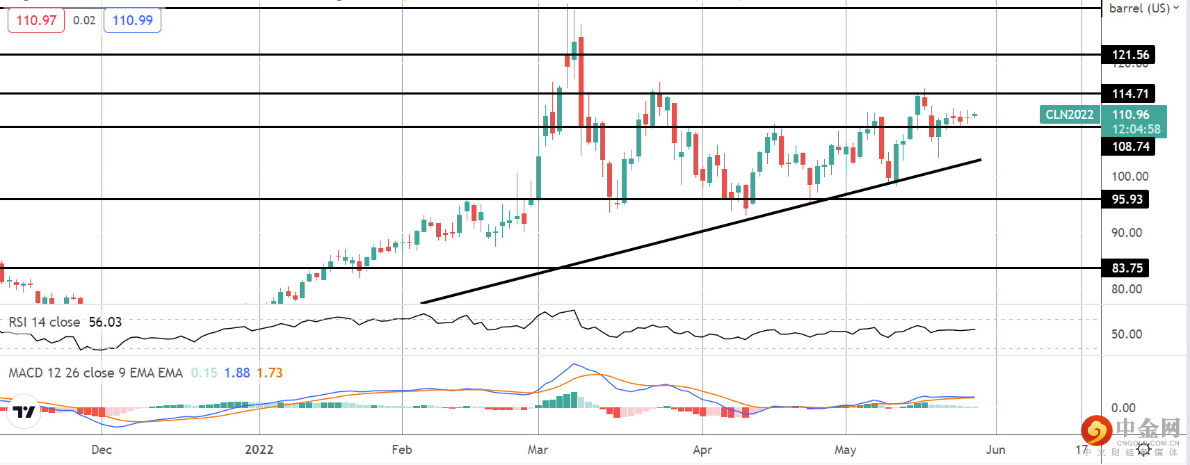 过去两周美元的疲软也帮助支撑了油价。然而,由于美元修正目前已经失去动力,加上昨天的鹰派 FOMC 会议纪要表明美元存在上行风险,美元的新一轮反弹可能会导致油价再次走低。预计即将到来的美国夏季驾驶季节将对石油产生季节性需求。然而,随着汽油价格的上涨以及家庭面临生活成本危机,需求水平可能会低于之前的平均水平。