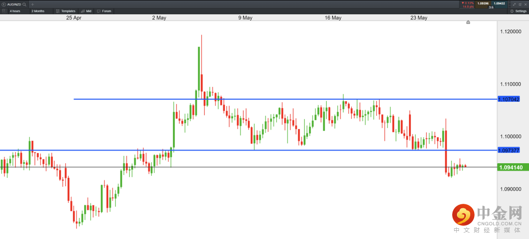 澳元兑纽元自5月5日冲至高点1.12附近后,陷入20天的高位震荡,价格运行于1.097 – 1.107区间。而在昨日价格失守该区域,这意味着后市回落概率更大。