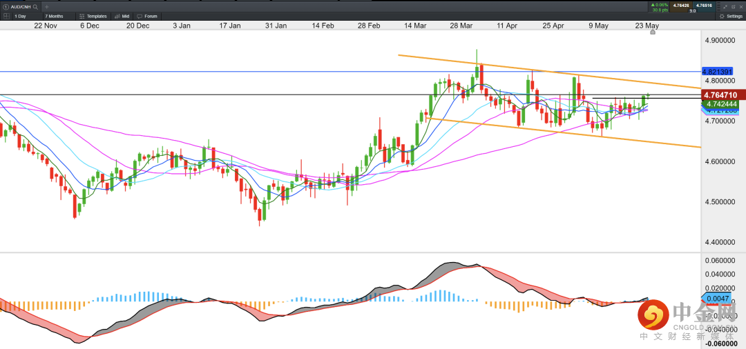 自5月17日以来,澳元兑人民币始终处于4.7 – 4.75的震荡区间中,昨日成功突破该震荡区间,目前价格运行于4.768附近。从基本面上来看,中国今年的货币政策将持续配合稳增长维持宽松,货币政策通过下调利率为地产板块托底,刺激需求,通过放松信贷成本以促进融资需求。而现阶段实现中国2022年GDP5.5%的增长目标必须稳住地产和扩大基建投资,而促进消费需要保证居民拥有充足的现金流。因此,宽松仍需进行,人民币汇率将维持低位运行。澳元汇率受澳联储加息刺激将进入反弹周期,对人民币将持续处于强趋势。