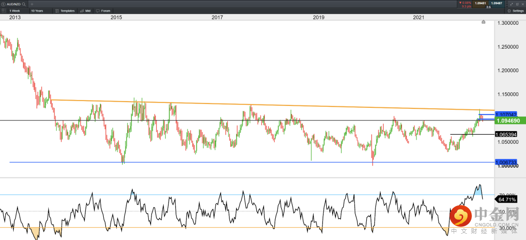 周线级别澳元兑纽元自2013年以来始终运行于1.0 – 1.12的宽幅震荡区间,因此该区域具有强阻力。在过去的两周澳纽均以收阴告终,因此见顶概率较大。周线级别RSI指标处于超卖区间并形成明显背离。而在货币政策上,新西兰联储相较于澳联储更加激进,目前已经多次加息50个基点,并且或在7,8月继续加息50个基点。因此,纽元或将比澳元更强。