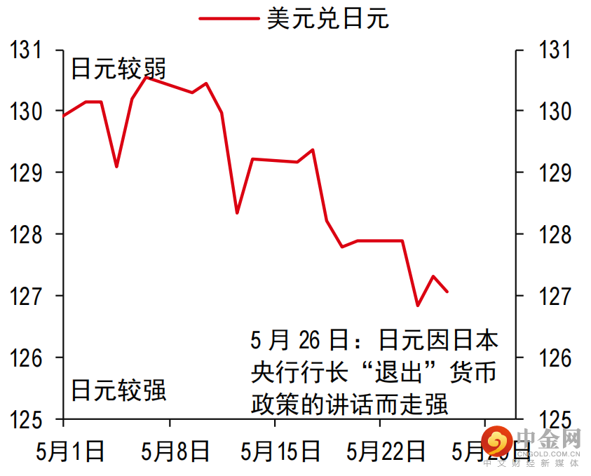 5月26日,日元进一步走强,美元兑日元跌至盘中低点,而这仅仅是因为日本银行行长黑田东彦(Haruhiko Kuroda)提到“退出”(图1)。我们认为,日元对日本银行行长黑田东彦言论的乐观反应是有选择性的,外汇市场只关注他的以下言论,即日本银行的政策“退出可能不容易,但日本银行可以管理得很好。”(彭博资讯,2022年5月26日)。然而,这是对日本议会提问的回应,而不是日本银行行长为最终退出宽松货币政策铺路而做出的积极尝试。日本银行行长还认为,目前2%的通胀水平不太可能在未来几年持续下去,并补充道,必须暂时保持宽松货币政策(彭博资讯,2022年5月26日)。