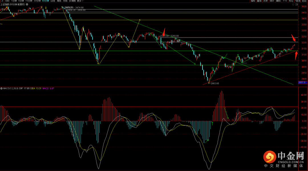大盘延续上涨一度上攻到3188,短期注意六十分钟的上升趋势线,在没有跌破之前大概率还会有反弹的空间,而上方下一个关卡可能会出现在前期的中枢平台3205到3244这个区间。而日线则需要关注macd的量柱是否能够继续维持扩张。在没有出现收敛之前大概率还不会出现试探3054点支撑的可能。