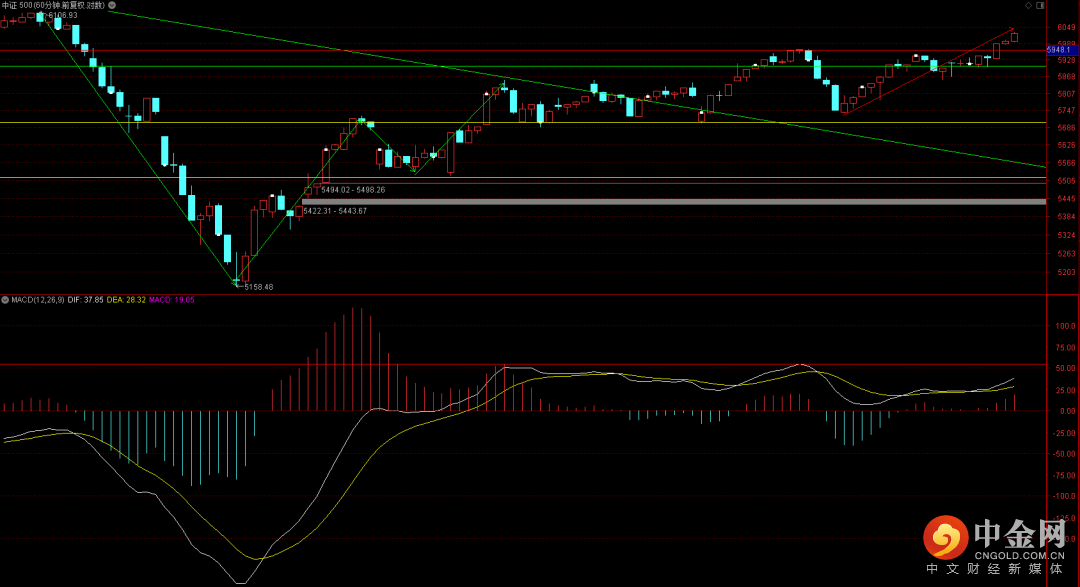 中证500出现扩张上扬,短期注意六十分钟是否会有顶背驰结构的出现,如果能够维持强势上行,则有概率在6100点附近的遇到下一个压制位。而由于日线的三卖结构后续的反弹空间相对可能有限,注意把握好高抛机会。