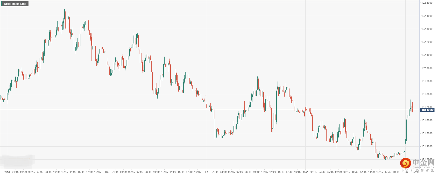 美元指数周一收盘大幅冲高后,今日开盘跳升至101.68附近,因早先美元因阵亡将士纪念日公众假期休市,导致美元下行交投清淡,不过随后美元从探底回升。