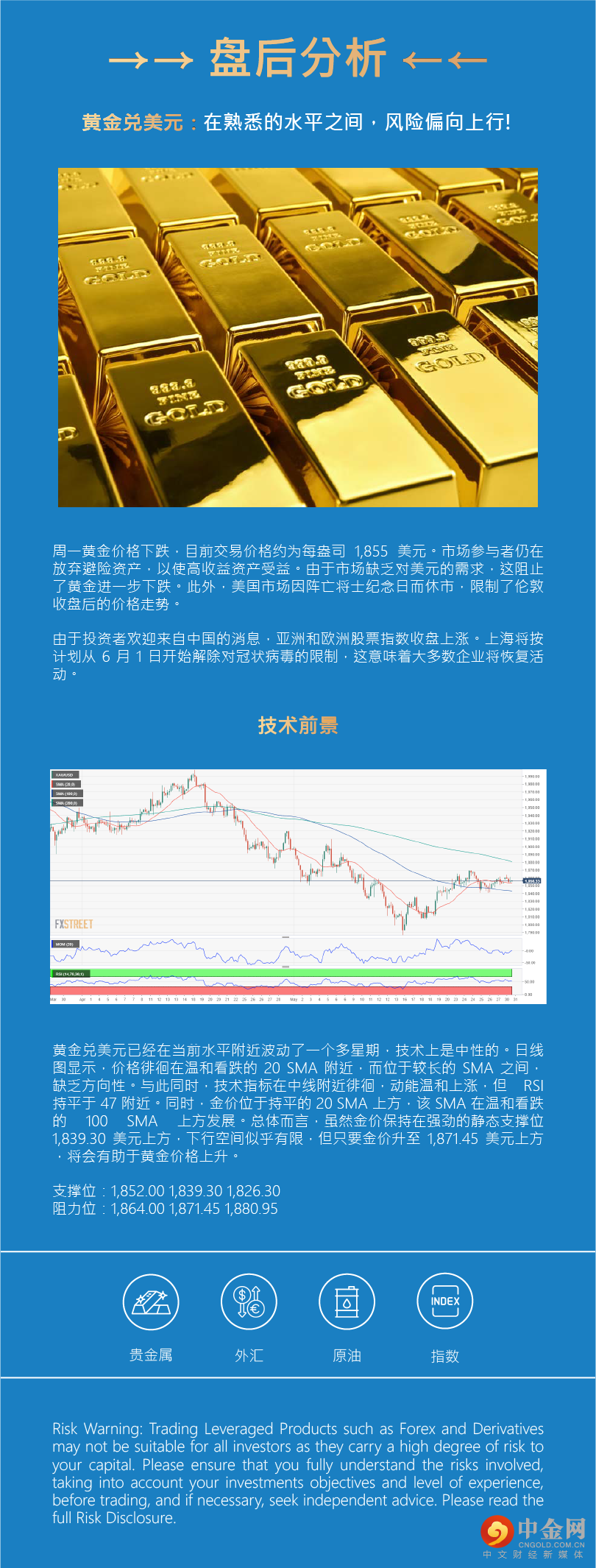 黄金兑美元在熟悉的水平之间,风险偏向上行!