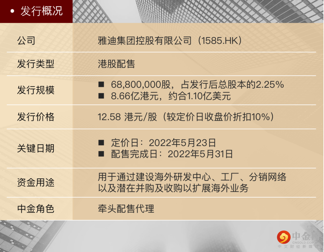 雅迪集团控股有限公司(“雅迪控股”或“公司”,股票代码1585.HK)港股配售项目已于2022年5月31日完成,发行规模为8.66亿港元(约1.10亿美元),中金公司在此交易中担任牵头配售代理。