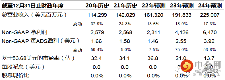 我们预计公司2021-2024年收入CAGR16.6%,Non-GAAP净利润CAGR 36.1%。根据DCF法,考虑到美国进入加息周期及中概风险,取WACC=14%,长期增长率为2%,获得目标价80.00美元/314.00港币,较当前价格有49.03%/40.93%的提升空间,维持买入评级。