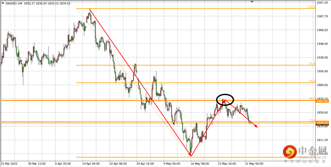 4小时图看,现货黄金在1867美元受阻明显,该位是前一波1998-1787的下跌黄金分割39.2%的位置,为空头弱防守位,金价在此受此回落说明多头反弹力度并不强,后市大概率仍延续震荡下跌为主。