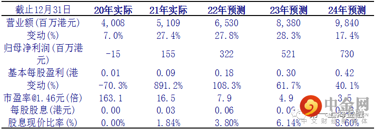 公司在汽车零部件布局多年,刚刚进入收获期,收入规模的攀升使得该板块扭亏应盈,并逐渐放大利润。我们预测公司2022-2024 年收入为 65.3/83.8/98.4 亿港元;归母净利润3.22/5.21/7.3 亿港元,对应 EPS 为0.18/0.30/0.42港元。我们给予公司2023年10倍PE的估值,目标价3.0港元,较现价有 116% 的上升空间,给予买入评级。