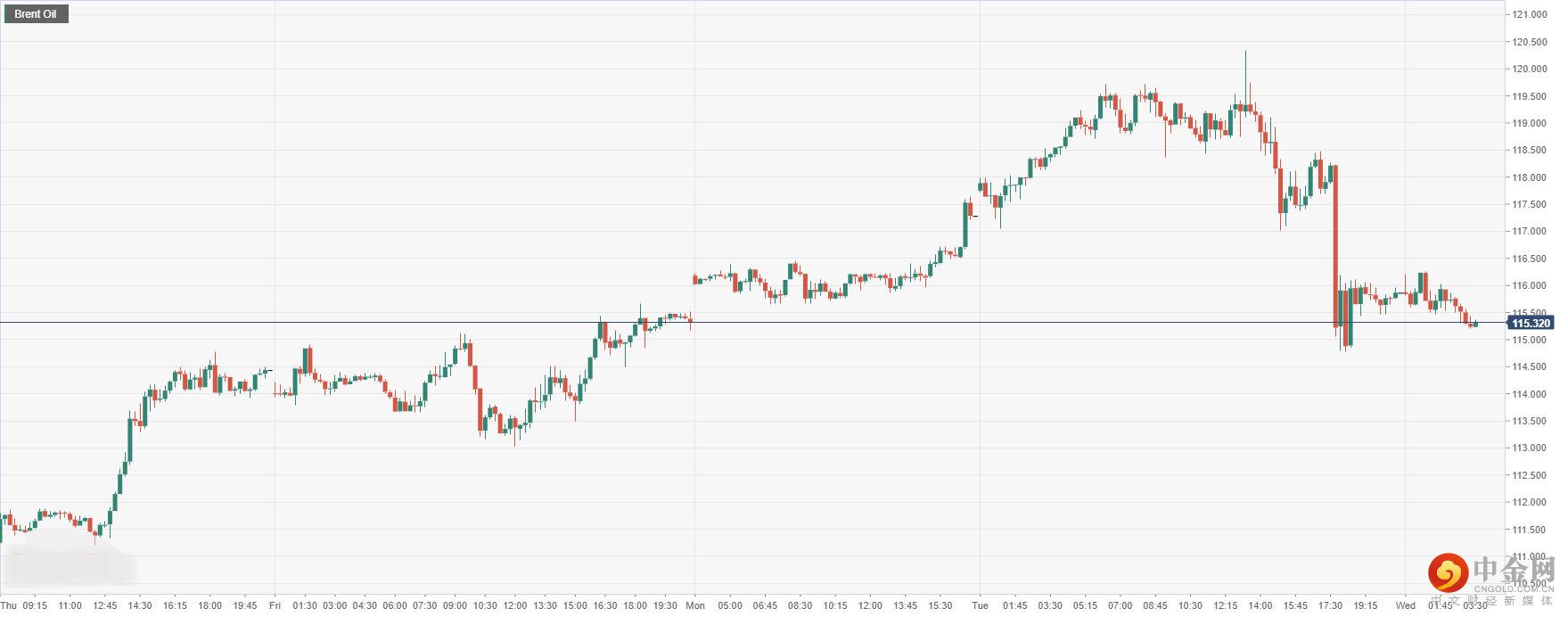 布伦特原油周二收盘大幅回落后,今日开盘跌至115.32附近,因部分产油国正探讨暂停俄罗斯参与OPEC+产油协议,导致油价下行震荡疲软。