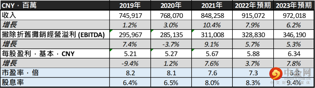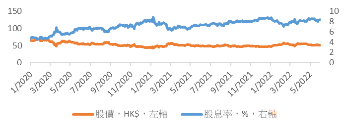 股息率升穿8厘,有中长线投资吸引力:然而,上述市场面整固,却为中长线投资者带来更吸引的部署机遇。现时中移动2022年预测股息率已升穿8厘(请见图一),为过去两年半的高位水平,而(a)2019-23年每股派息年度复合增长(CAGR)料达10%(请见图二)、(b)管理层「2022-24年间提高派息比率,从60%上调至70%」政策(请见图二),成为股息率走高的基石之一。