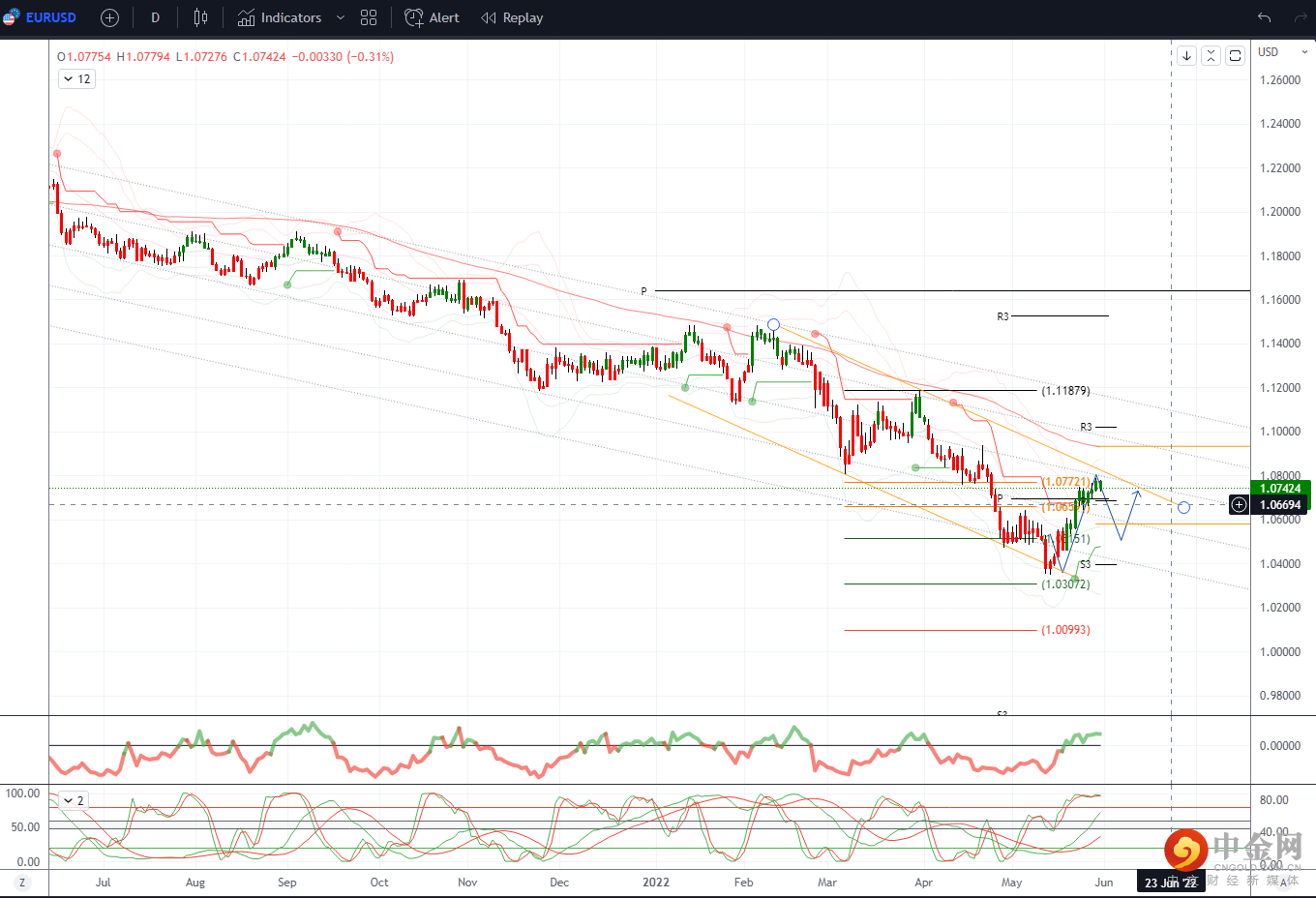 从 2022 年高点 1.1495 到 2022 年低点 1.0349 的 38.2% 回撤位是 1.0787