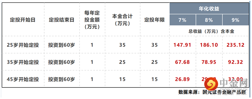 假设每年定投1万元,25岁开启定投,按照7%的年化收益,在60岁时,可以获得147万的总收益;如果35岁开启定投,那么会收获67.68万元的总收益,如果45岁才开启定投,那么最终只有26万的总收益。所以啊,定投越早越好~