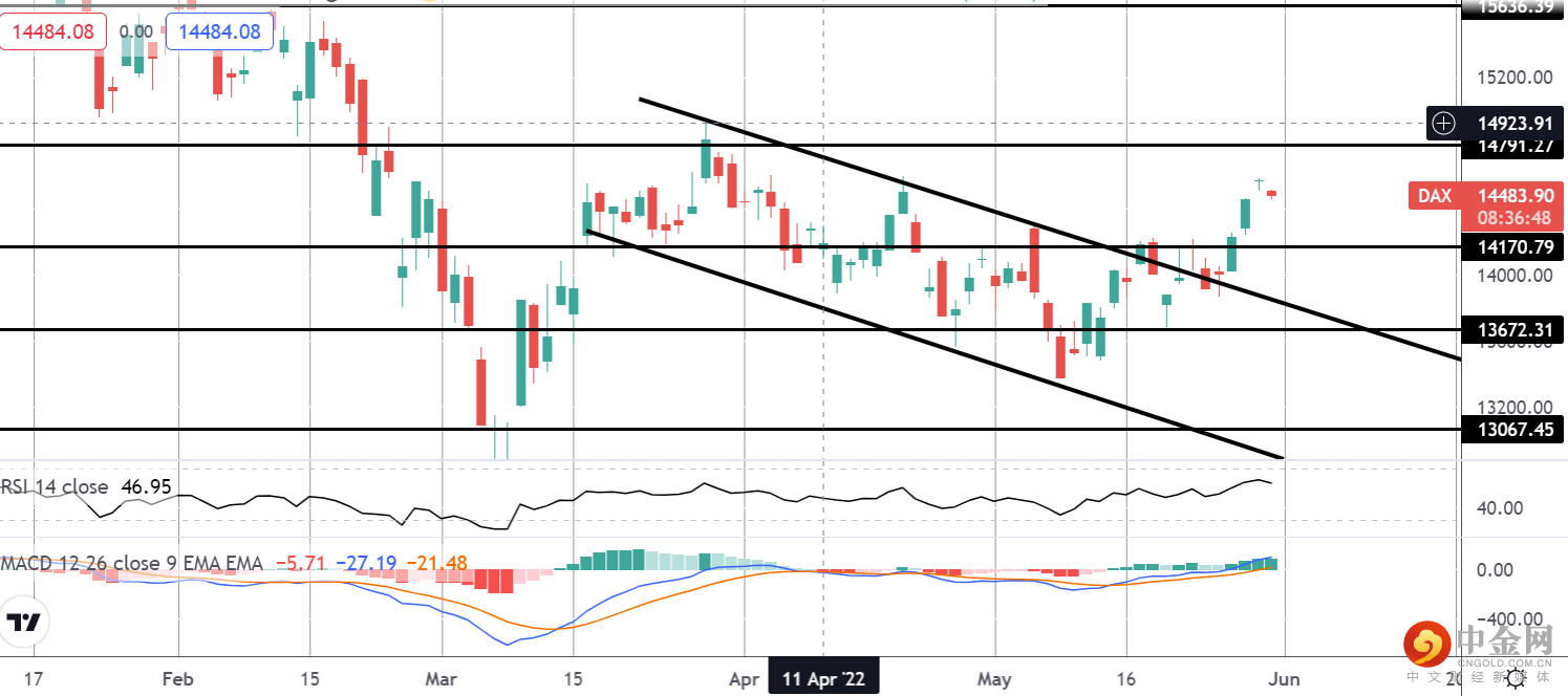 DAX 在熊通道上方的反弹使价格突破 14170.79 水平。虽然在此上方,并且 MACD 和 RSI 都看涨,但接下来的重点是测试 14791.27 水平。