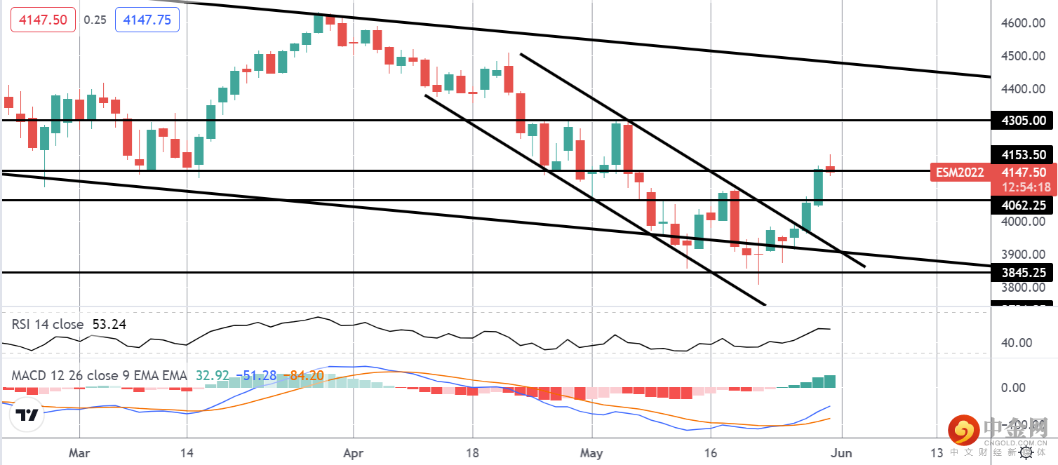 标准普尔指数的反弹使市场突破了构成近期下跌的局部熊市通道以及 4062.25 水平。 然而,目前,价格停滞不前,测试 4153.50 阻力位。 如果我们在这里失败,焦点将在短期内回到进一步下行。 然而,MACD和RSI均看涨,有进一步推向4305的空间,而4062.25作为支撑。
