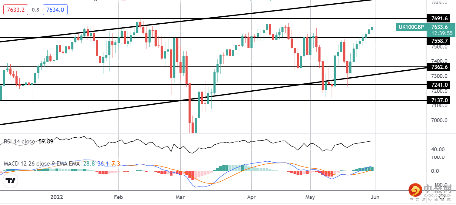 富时指数从 7241 水平反弹,市场在本月结束时创下新高。 价格现已突破 7558.7 水平,MACD 和 RSI 均看涨,重点是下一个测试 7691.6 水平和上方的多头通道顶部。 不利的一面是,需要注意的关键支撑位是 7362.6。