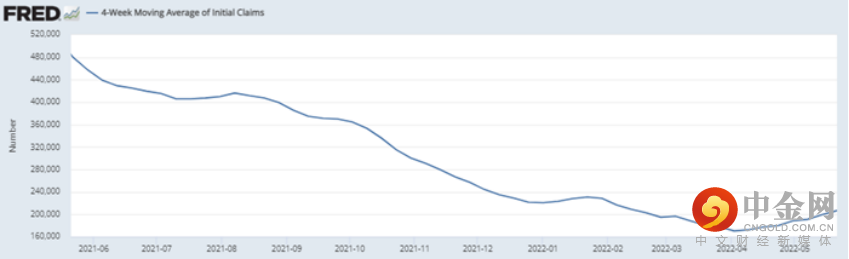 接下来我们观察一些较传统的经济数据,比如四周均请人数。4月初,四周均请人数为17万左右,创下历史低点。随后这个数字不断增大,持续时间为疫情爆发以来最长,此文发稿时增至20万左右: