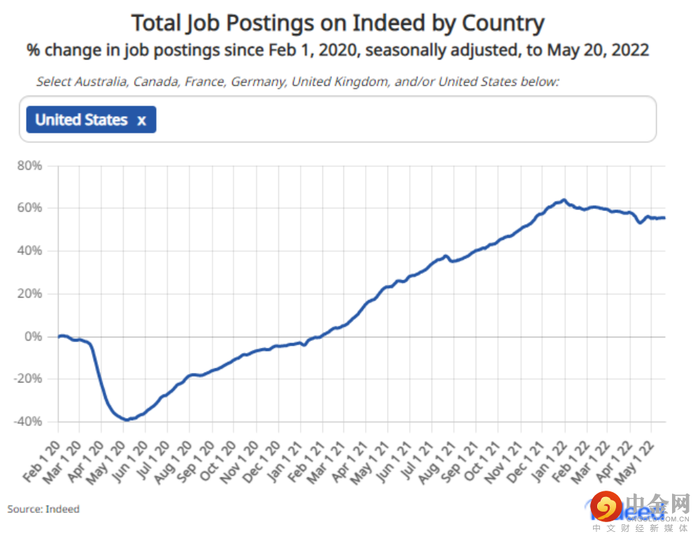 值得注意的是,高频数据呈现一些就业增长可能放慢的早期信号。比如,Indeed.com上发布的总职位数年初以来走平,而同期前后美国职位发布的同比增长率达到顶峰,只是相对疫情前的水平还是激增55%: