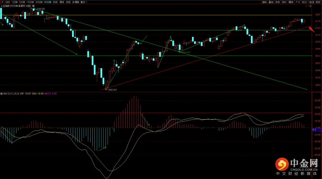 大盘出现五分钟双背驰后出现调整,短期六十分钟的结构依旧还是向上,关注周四是否能够维持强势继续上行,如果周四日线macd量柱出现钝化则大概率奠定筑顶结构,注意回避跌破上升趋势线后可能出现的调整。