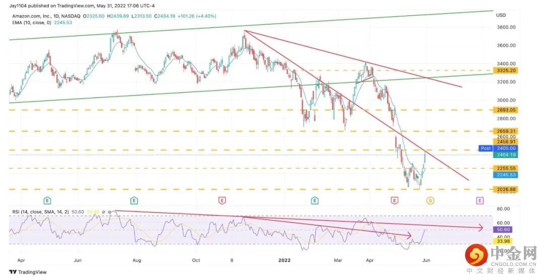 在亚马逊公布了糟糕的第一季度业绩财报后,亚马逊的股价回升至其跳空缺口的趋势线上。该趋势线恰好是亚马逊股价止涨的水平。我认为目前的涨势很大程度上是超卖反弹。
