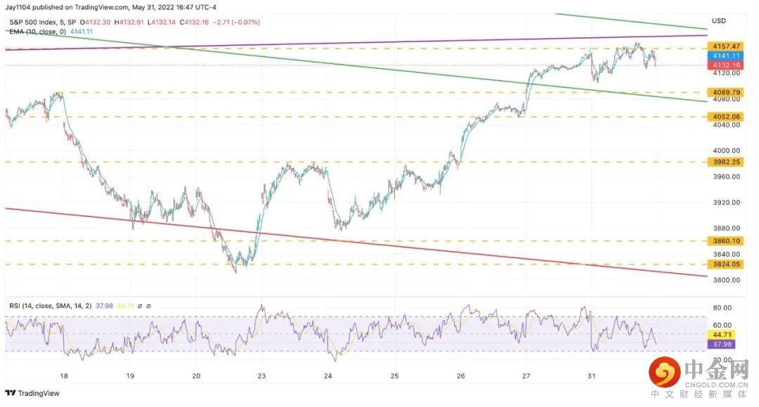 股市今天大幅波动,开盘时大跌,午盘时转为上涨,随后下跌直至收盘。标普500指数收盘下跌63点,5月上涨了0.01%。标普500指数全天在4100点至4160点之间挣扎。该指数今天四次测试了4160点水平线,在收盘时卖方取得上风。即便是近50亿美元的收盘买盘失衡也未能提振标普500指数。