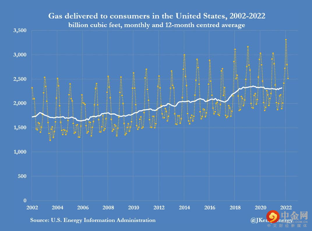 根据美国能源信息署最新编制的月度数据,美国国内天然气消费量与新冠疫情期间(2020—2022)同期持平。