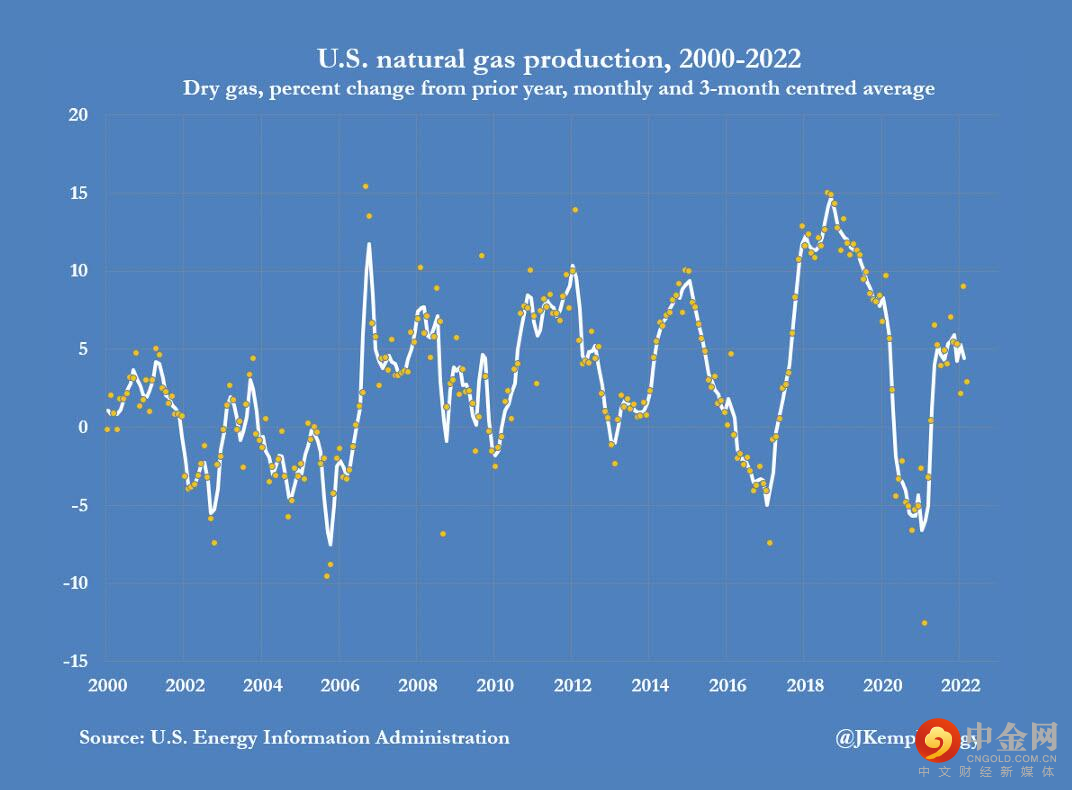 然而,由于价格低廉和行业内部整合,2022年美国国内天然气产量仅增加了4330亿立方英尺,是去年的5%。
