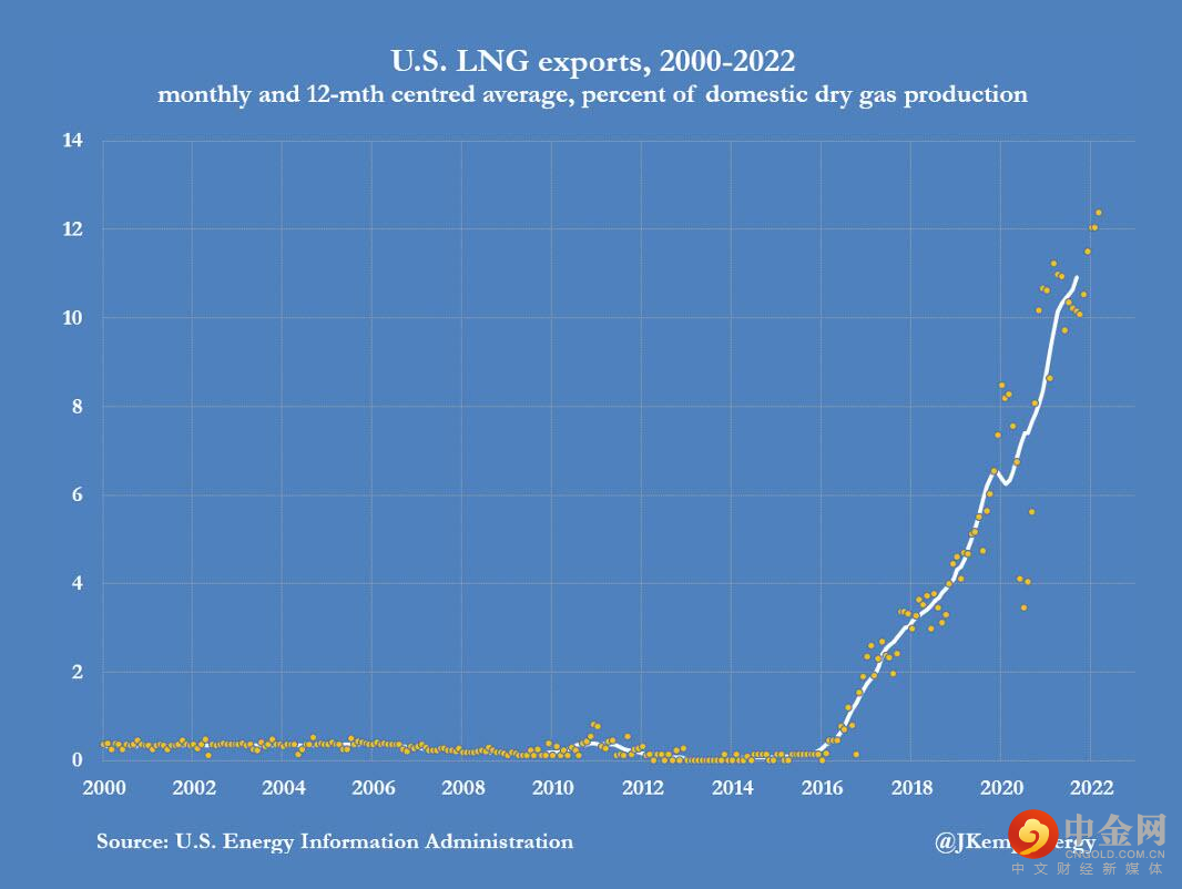 美国液化天然气出口量占国内天然气年产量的比重已从2019年的4%增长到12%左右。未来,这一比重还将进一步增加。
