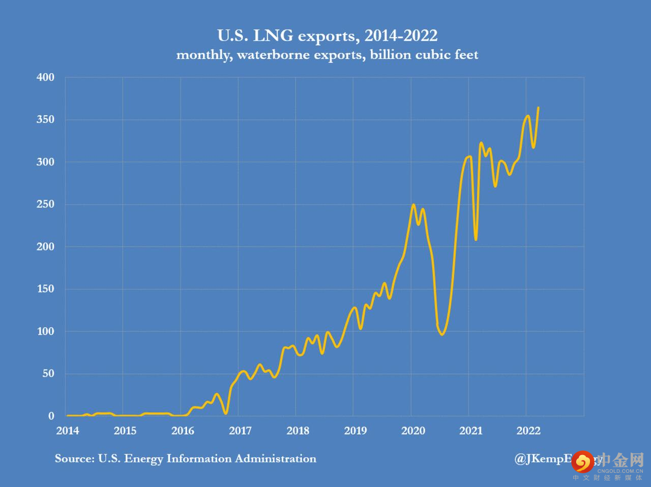 根据坎普的说法,与2019年同期相比,在2022年前三个月,美国液化天然气出口量增加了6740亿立方英尺,增幅高达87%。