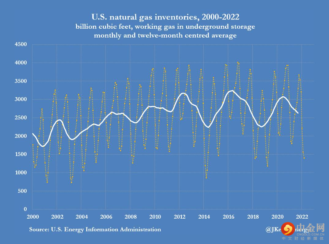 截至2022年3月底,美国天然气地下储存设施中的天然气储量比新冠疫情前五年的年平均水平低3180亿立方英尺。