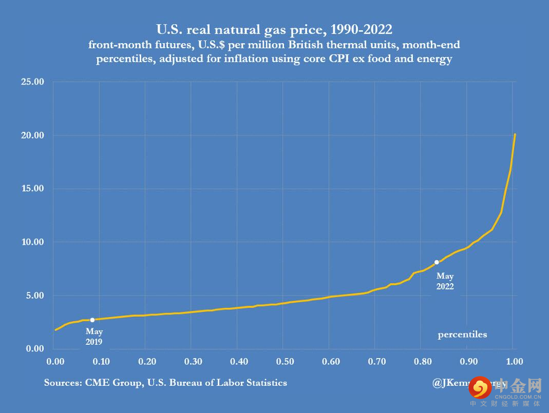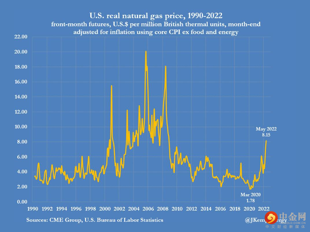 5月,经通胀调整后,天然气近月期货价格攀升至2008年11月(正值金融危机和大衰退的前夕)以来的最高水平。