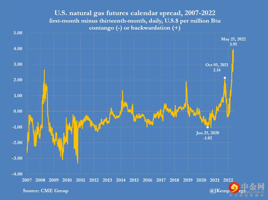 与天然气一年远期均价相比,今年的天然气期货价格已进入创纪录的现货溢价水平。这反映出市场预计美国将出现天然气短缺。