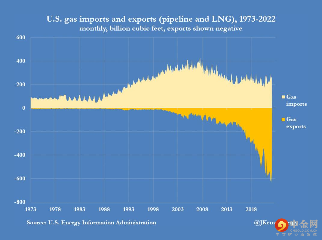 2022年3月,各种形式的管道和液化天然气净出口总量达到创纪录的3770亿立方英尺,高于2019年3月的1210亿立方英尺。