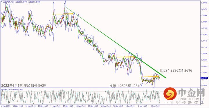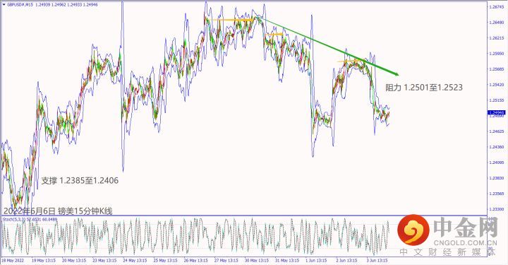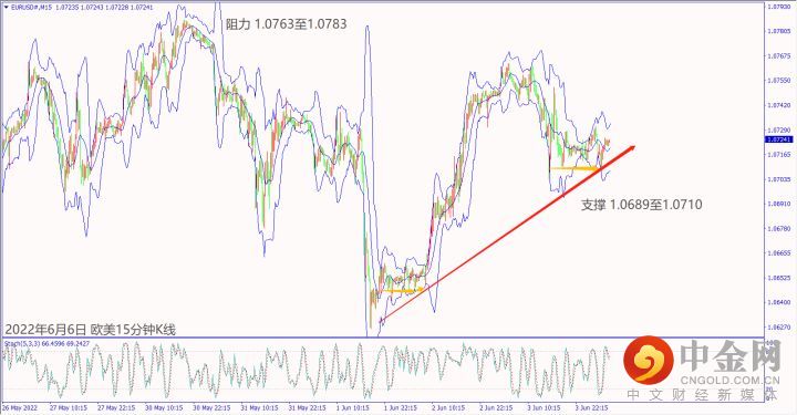 日级别线图,近期在1.0700关口附近震荡,守住5日均线,可能启动涨势;15分钟K线,短线形成盘涨,守稳上升趋势线,大有可能挑战前高阻力。