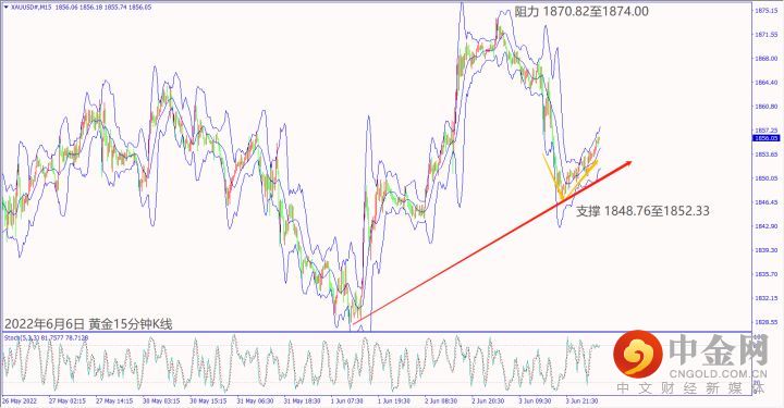 日级别线图,近期维持在1840~1870区间震荡,一旦突破30日均线,可能启动涨势;15分钟K线,短线出现V型反转,守住上升趋势线,大有可能挑战上方阻力。