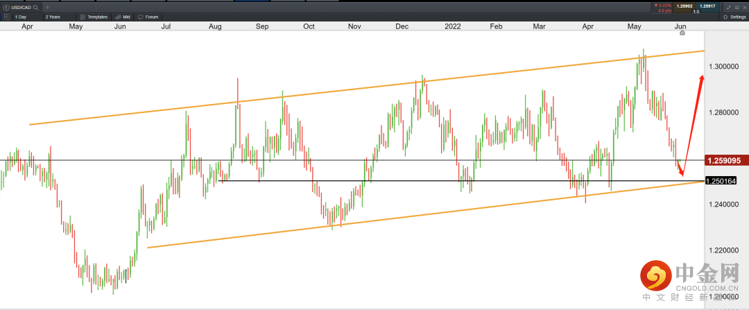 美加上周整体呈现连续下跌趋势,走势符合我们先前预期。但从趋势上看价格已经处于震荡上行的通道下轨支撑附近,因此后续反弹概率较大。考虑到美元指数目前有企稳迹象,而加拿大央行上周加息50个基点已经落地,市场消化进入尾声,加元的强势将迎来修复。因此,在此区域附近可进行梯度跟踪处理,下方支撑1.25。