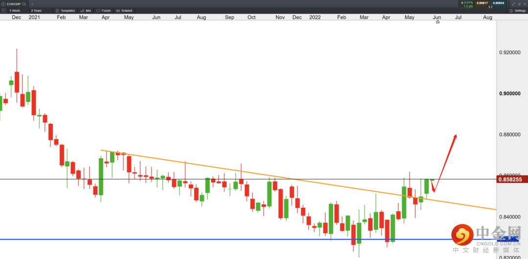 经历了4周的反复,欧元兑英镑周线级别终于向上突破长达13个月的震荡下行结构,上周收线显示多头较强,因此后续进一步上行概率较大。考虑到本周欧洲央行将进入紧缩周期,并做出更多政策指引,转鹰的欧央行将使欧元持续强于英镑(英国央行在政策上后劲不足)。因此,投资者可在0.85附近进行跟踪处理。上方第一目标:0.866。