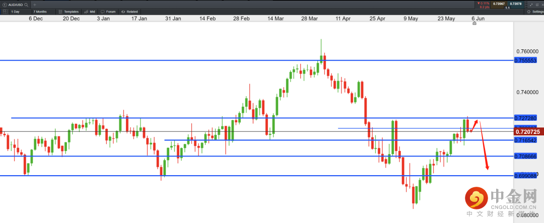 在加息预期,以及美元下跌的双重因素下,澳元兑美元自5月中迎来了连续反弹,最高触及0.727附近。该位置为重要的多空分水,从目前来看,此处作为此轮反弹终点的概率较高。虽然澳联储本周预计仍将加息25个基点,但加息幅度较为缓慢。因此,如若澳联储的举措如市场预期一样,政策的稳健将被市场解读为缺乏鹰派力度,澳元因此会利多兑现呈现下跌趋势。而美元的止跌也将为澳元形成压力,因此,本周倾向于空头趋势。