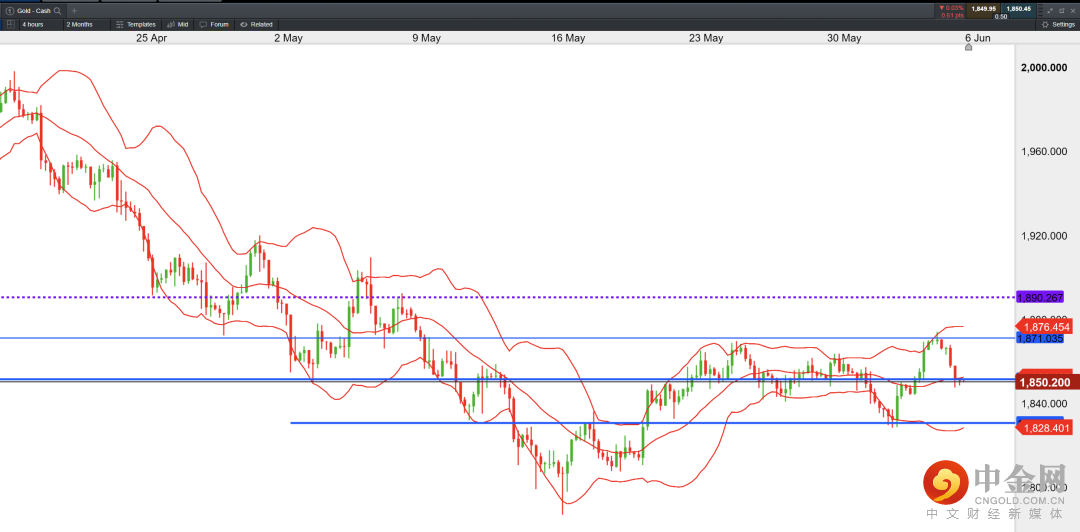 黄金上周五在1870遇到明显的阻力,目前价格回落至4小时布林中轨1850的关键支撑。该位置作为重要的多空分水岭决定了短期的方向性。若失守该区域,价格或回落至1830甚至更低的1790。与美股同理,市场鹰派情绪的强化将使黄金承压,因此本周倾向空头。
