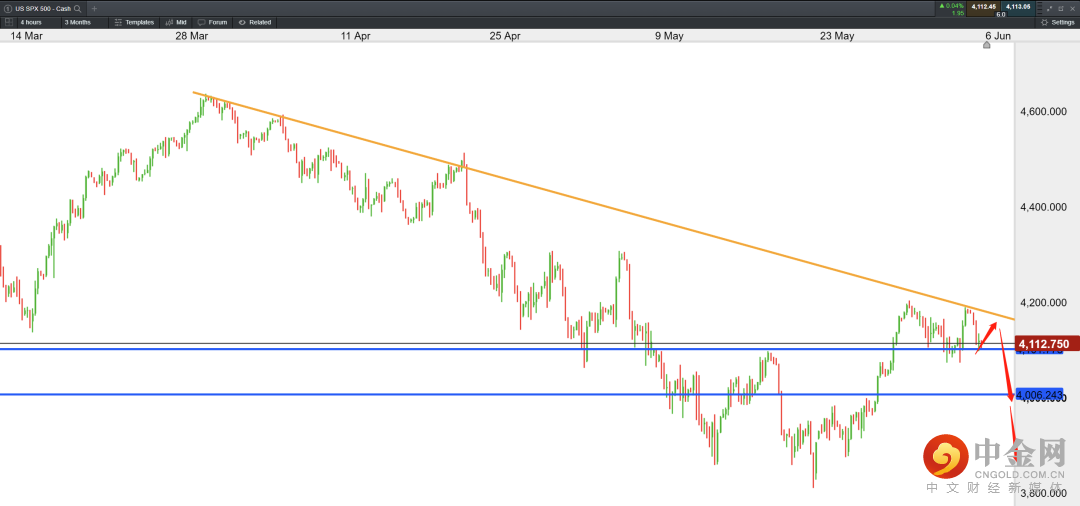 标普500指数上周在周一冲高至4200后,整体在4100 – 4200的区间内进行震荡。反映出高位面临较强的阻力。由于上周的非农数据整体表现强于预期,而本周的通胀数据显示通胀并未出现较为明显的回落,价格压力犹存,市场中鹰派预期预计将得以强化。而在下周的美联储利率会议上大概率加息50个基点,并会对后续政策路径进行指引,这会加剧市场不稳定性引发抛售,因此,标普500指数本轮的反弹高点或在4200。而从4小时趋势上看,标普500指数承压于下降趋势线。因此,后续或回落至5月中旬低点3900附近,甚至更低。