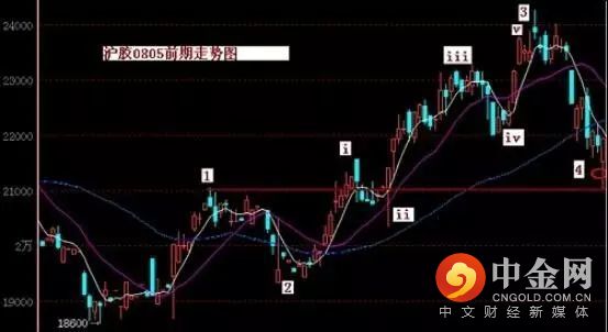 再看上图,这是沪胶0805在07年底的一段走势图。图中可以明显地标注出大浪级别的1、2、3、4浪。其中,第三浪是延长浪。图中最后一个K线处于一个关键位置。依照浪形规则,第四浪不会进入第一浪的价格领地。那么第一浪的高点之下一个点位就构成一个较好的支撑点位。如果我此时做多,请不要批评我逆势而为,因为我有一个做多的较好的关键价格点位止损,就算我看错了,我也会在很小的价格空间中止损出局,不会有太多的损失。我没有任何事后诸葛亮的意思。上面两个图,我都没有将后续的走势画出来,因为后续走势本来对于现在就不是特别重要,重要的是你入场时,有没有找到一个让你满意的止损位。