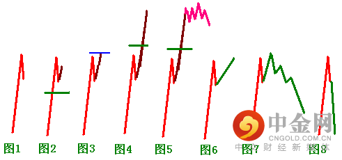 图6是第一式的一个失败图,其表现为上升速度明显被改变了,当然你也可以依照你的看法追多,毕竟趋势还是向上的,但这与我所写的第一式不是一回事了。图7是另一种失败图,你的多单恰好在最高点位成交,不要为此恼火,这是正常的,此时接受亏损,如果你能长期很好的运用此式的话,这点亏损是微不足道的。图8是很少见的一种失败图。价格呈现尖锐V字形反转,此时你应该只下出去了止损单,而开仓单还没有下出去,对你来说不会造成任何实际的损失。(微信公众号:蟹蟹谈交易,领取100条顶尖交易员思维)