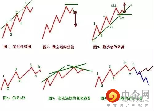 不过,请各位再看看图4与图1没有什么区别,但是我认为,这是两个绝缘不同的走势图。图1中1、3、5浪高点形成一条直线,说明上升通道保持良好,此时轻易否认这条通道的看法显得有些逆势而为。但图5中对图4的走势高点做了一个连线,各位可以看到,每一次将相邻高点连起来,就看到了一条更为平坦的趋势线,但这三条趋势线被看到之后,你应该想到,上升趋势正在慢慢的改变,前期多单应该慢慢考虑出局。可以像上图的图2一样选择做空。图6是对图5后续走势的一种预想图,如果后续向上,也是可以的,那么前期的上升5浪成为大一浪级别的上升第一浪,前期的回调三浪形成了大一浪级别的回调2浪。如果后续走出下降趋势,那么其c浪应该由5浪驱动形成,会有较大跌幅。(微信公众号:蟹蟹谈交易,领取100条顶尖交易员思维)