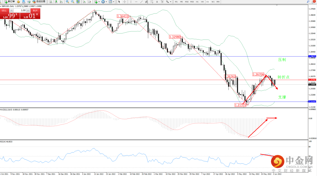 低位多头动力强势震荡上扬,触及延续布林带指标上轨持续上移至1.26706附近震荡,短期回撤至中轨附近整理,布林带指标呈张口走势后开始收口,上方压制关注1.29673附近节点,低位支撑关注1.22143附近节点,关注1.25760附近转折点,MACD指标处于空头区域低位震荡上移至0轴线附近徘徊,RSI指标处于50均衡线附近窄幅整理,如图: