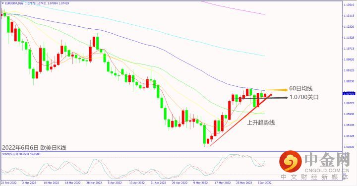 日级别线图,近期在1.0700关口附近震荡,一旦突破60日均线,可能启动涨势。