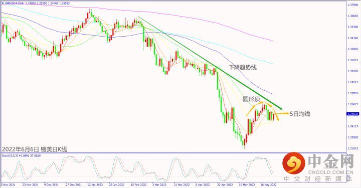 日级别线图,近期出现圆形顶反转,5日均线反压,可能下探1.2300关口。