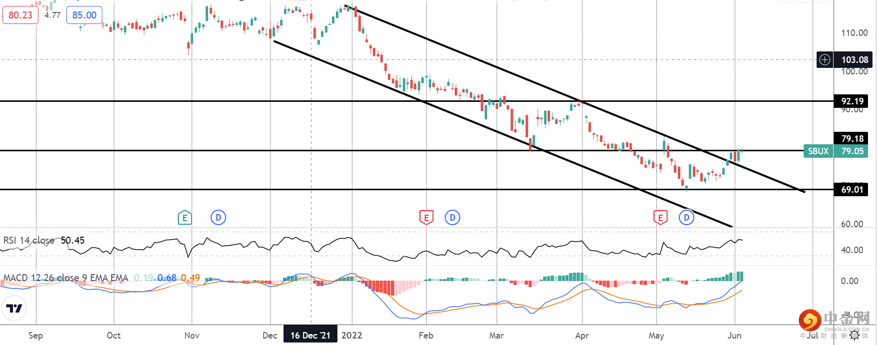 星巴克股价最近在 69.01 水平获得支撑,反弹走高,价格从年初至今的高点突破看跌通道。该股目前正在测试 79.18 的阻力位,MACD 和 RSI 均看涨,重点是突破该水平,突破该水平,为下一步上涨至 92.19 水平开辟道路。不利的一面是,69.01 仍然是需要注意的关键支撑位。