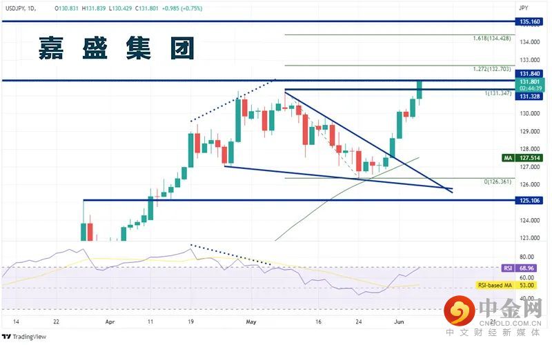 事实上,美元/日元确实一直在走高。日图价格于5月9日创下2002年4月以来最高点131.28后形成了下降楔形,此后的下跌守住了50天均线并在5月31日打破下降楔形并强力上攻再无疲态。美元/日元今天攻克5月9日以来高点,逼近2002年2月以来水平阻力位131.84附近。后市阻力在5月9日高点到5月24日低点行情的127.2%和161.8%扩展位,分别落在132.70和134.43附近。如果攻克,可能上看2002年1月以来水平阻力位135.16。如果受阻回落,下方无阻力,直至50天均线127.52,然后下看下降楔形的上轨下降趋势线所在的126.75附近、5月24日以来低点126.36。