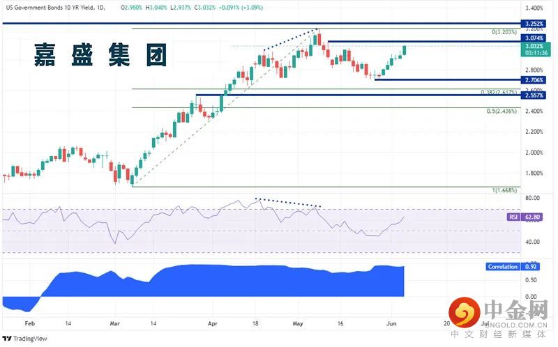 美国10年期国债收益率目前连涨6天。来自中国方面的消息振奋市场信心,进而引发债券抛盘。上海市全面复工复产,而北京市正在解除封控。另外,中国表示,将很快结束对中国版优步滴滴的调查,其应用程序有望很快再度在各大手机平台上线。对此,债券交易者做出抛售债券的决策,导致10年期收益率回到3.00%上方,即5月11日以来最高点3.07%。如果攻克,可能上看5月9日以来高点。如果进一步攻克,可摸至2018年11月以来最高点3.25%。如果受挫回落,价格可能跌至5月26日低点支撑2.71%、3月7日低点到5月9日高点行情的38.2%回档位2.62%、水平支撑位2.56%。请注意,下图底部展示了美国10年期国债收益率与美元/日元之间的关系,两者当前相关系数高达+0.92,呈现出高度正相关联系。如果收益率继续上涨,美元/日元应可随之走高。