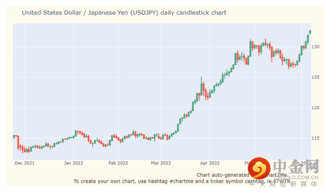 行情数据显示,美元兑日元周二早间大涨近70点,最新交投于132.55附近,盘初曾一度刷新2002年4月以来的最高位132.74。